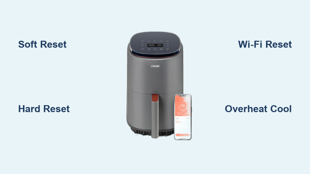 Your Cosori air fryer suddenly freezes on “88:88,” ignores button presses during dinner prep, or drops its Wi-Fi connection mid-recipe—leaving