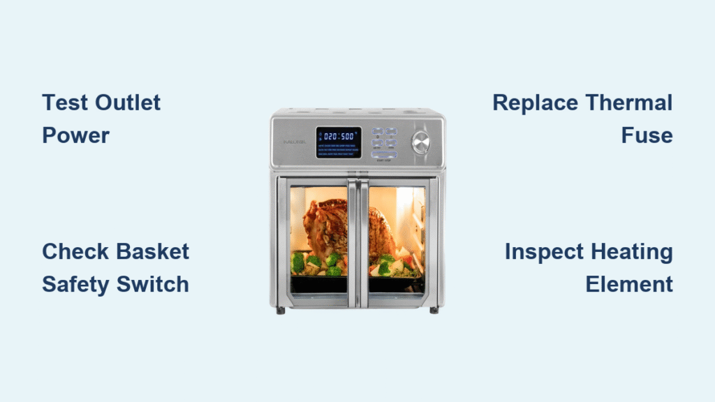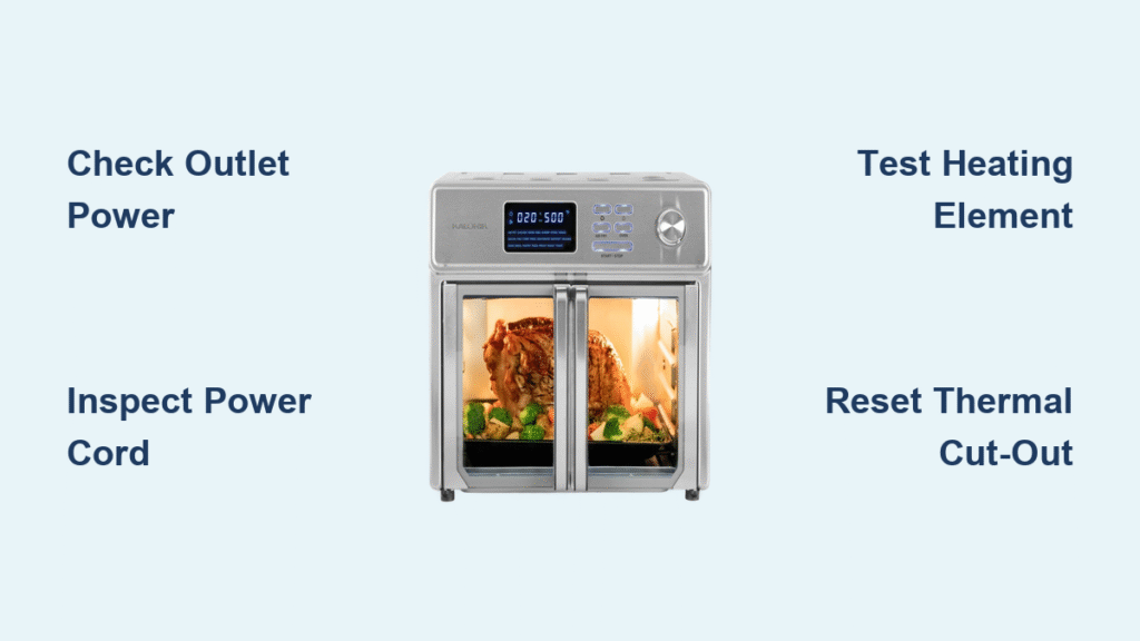 Your Kalorik air fryer sits cold while frozen fries wait inside, the display showing normal settings but zero heat. This