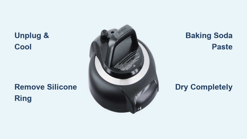 Unplug immediately after cooking—this isn’t optional. Even when the timer dings, the heating coil and plastic housing retain heat capable of causing severe burns for 15–20 minutes. Set a timer and walk away; never test temperature by touch. Crucially, never submerge the lid or main unit in water. Unlike dishwasher-safe baskets, the lid contains sealed electronics that corrode instantly when exposed to moisture. Water intrusion is the #1 cause of Ninja air fryer failures, so treat the lid like your smartphone: keep it dry. Always place the unplugged unit on a heat-resistant surface to cool completely before any cleaning begins.