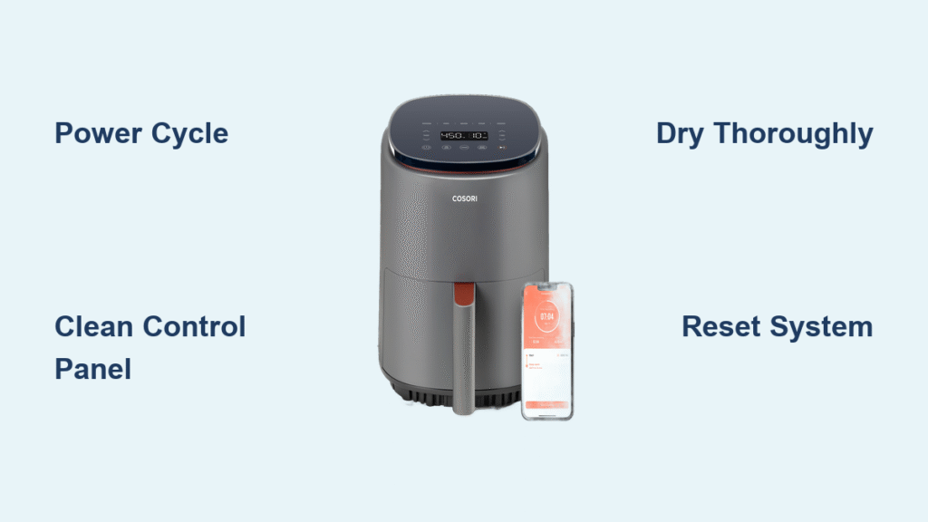 Most Cosori air fryer button issues resolve through systematic cleaning, proper power cycling, and moisture management—procedures you can safely perform without technical expertise. Start with the simplest solutions like thorough cleaning and complete power resets, which address the majority of control panel problems. When these steps don’t restore functionality, consider moisture damage as the likely culprit and allow extended drying time before testing again.