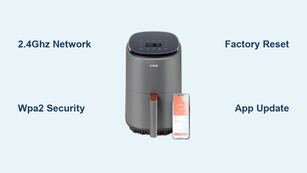 Your Cosori air fryer will never connect if your router only broadcasts 5GHz signals. Most modern dual-band routers combine both frequencies under one network name, tricking your air fryer into attempting an incompatible connection. Check your network name—does it end with “5G” or “5GHz”? If so, that’s your problem.
