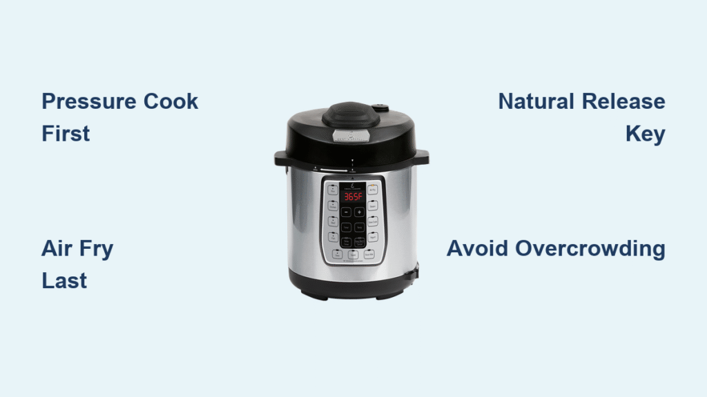 Pressure-cook ribs 25 minutes until bones slide out cleanly, then air-fry with barbecue sauce 5 minutes for lacquered, competition-style ribs. The combo method achieves fall-off-the-bone tenderness impossible with air-frying alone. Warning: Overcrowding the air-fry basket causes steaming—cook in single layers for that “shatter-crisp finish” reviewers rave about.