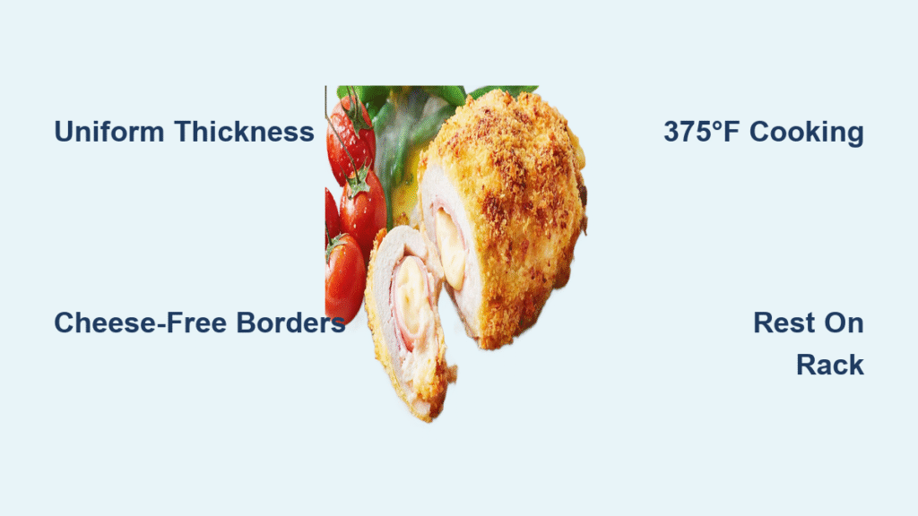 Leave ½-inch cheese-free borders on all sides. After rolling, pinch seams tightly and insert toothpicks at 45-degree angles—they grip better than straight pins. If cheese oozes early in cooking, reduce heat by 25°F immediately and extend time by 3-4 minutes. This slows melting while finishing the chicken.