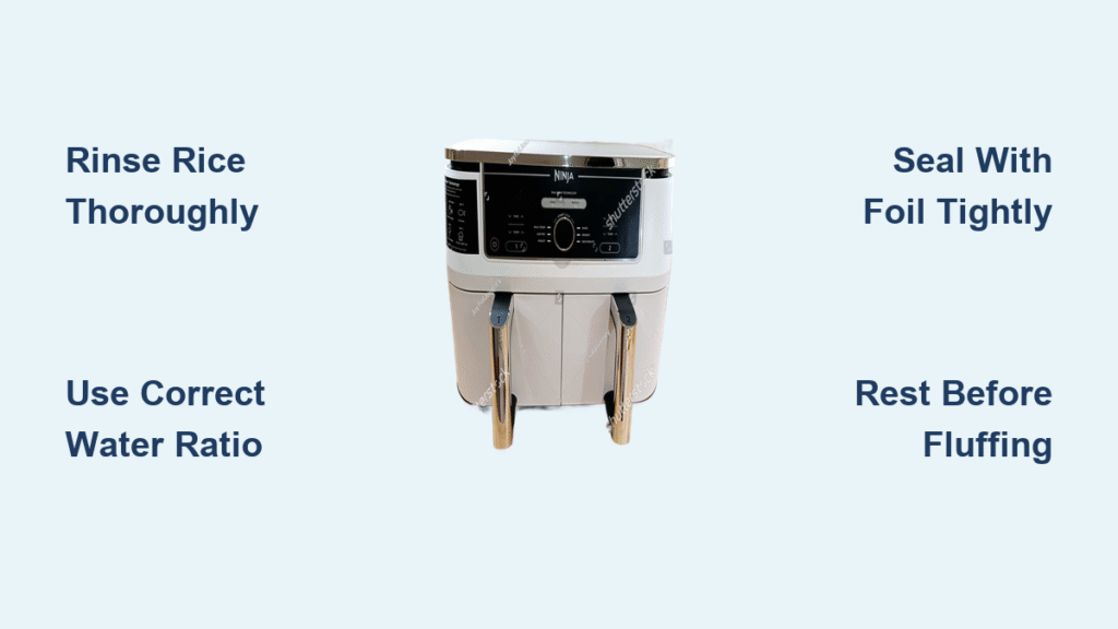 Cause: Water evaporated through loose foil or incorrect ratio. Fix: Double-seal the pan with foil and add ¼ cup water next time. For brown rice in pressure mode, increase cook time by 5 minutes. Always check that your Ninja’s seal ring is clean—debris causes steam leaks.