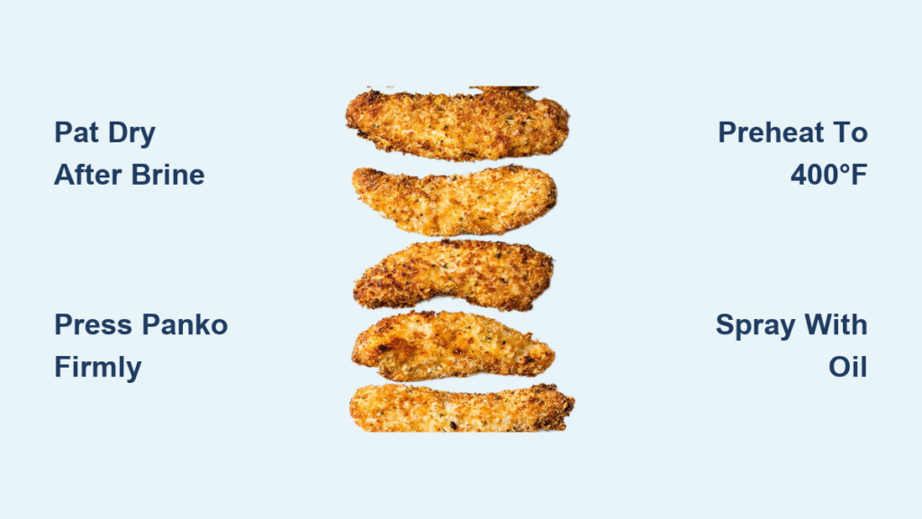 Skip this step and risk dry, stringy meat—especially at 400°F. Dissolve 2 tablespoons kosher salt and 1 tablespoon sugar in 4 cups cold water. Submerge tenders for 30 minutes minimum (up to overnight refrigerated). This osmosis process pulls moisture into the meat fibers, ensuring they stay succulent even when cooked to 165°F. Pro tip: Pat brined tenders thoroughly with paper towels before breading—any surface moisture causes coating slippage.