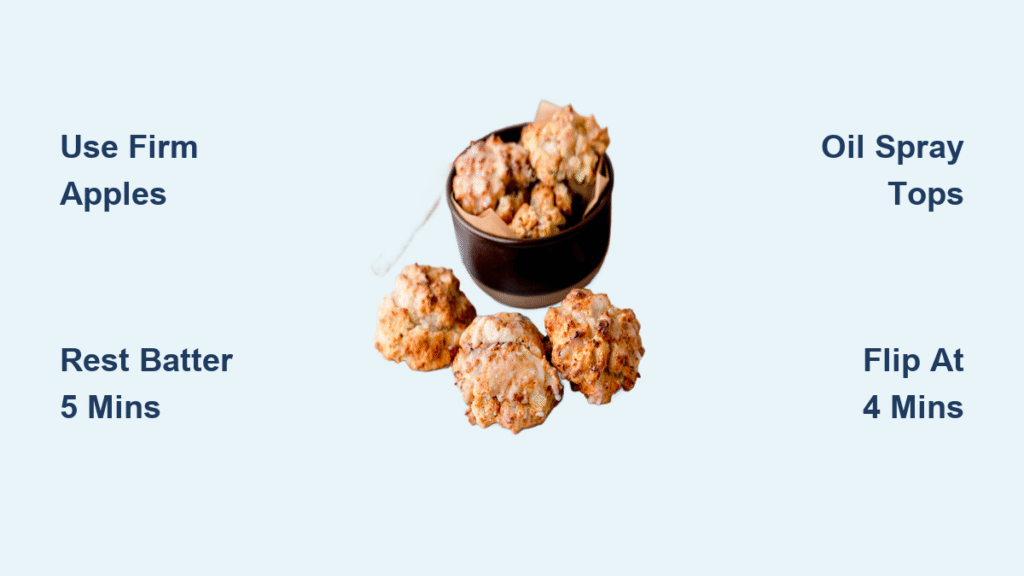 Unlike yeasted doughnuts, these cake-style fritters achieve bakery magic through smart air frying: light oil misting creates that signature crunch while convection heat locks in moisture. The secret? Perfect apple selection and precise batter consistency—no soggy centers or dry edges here. By the time you finish reading this guide, you’ll know exactly how to choose apples that hold their shape, build a foolproof batter, and troubleshoot common pitfalls.