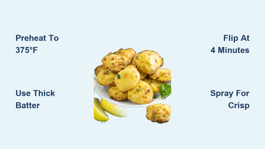 Setting your air fryer to 375°F for 5-7 minutes before loading batter isn’t optional—it’s the non-negotiable step that creates instant crust formation. Without this heat blast, hush puppies absorb ambient moisture instead of crisping, leaving you with gummy undersides. Test this yourself: compare a preheated batch against a cold-start attempt. The difference is night and day.