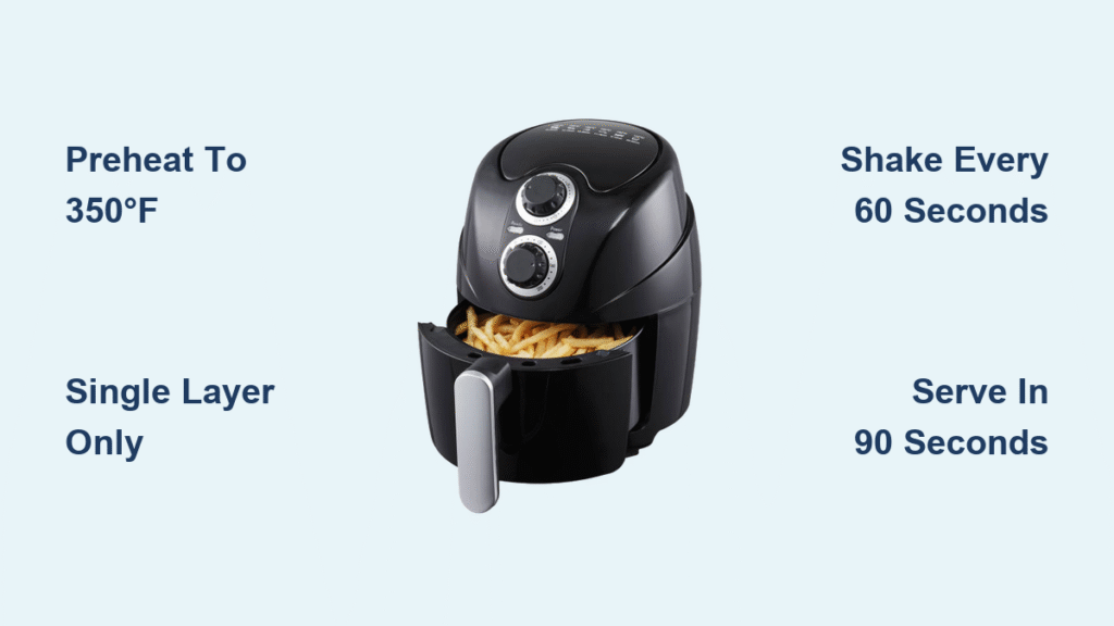 For curly fries or irregular shapes, shake the basket every 30 seconds during the first 2 minutes. If your unit has hot spots (common near the heating coil), rotate the basket 180° at the halfway point. Group similar-sized fries together—mixing thick steak fries with shoestrings guarantees some will burn while others stay cold.
