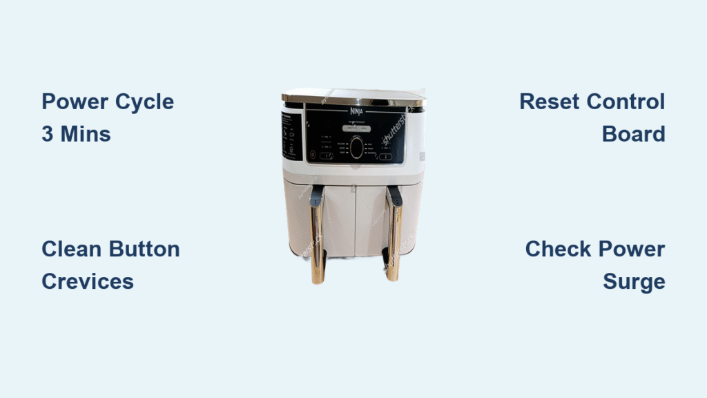 Hold the power button for 10 seconds on most Ninja AF101/AF161 models until the display flashes three times. This clears corrupted timer memory while preserving your favorite presets. For newer FD401 series, use the temperature down + timer up button combo—hold for 5 seconds until double-flashing occurs.